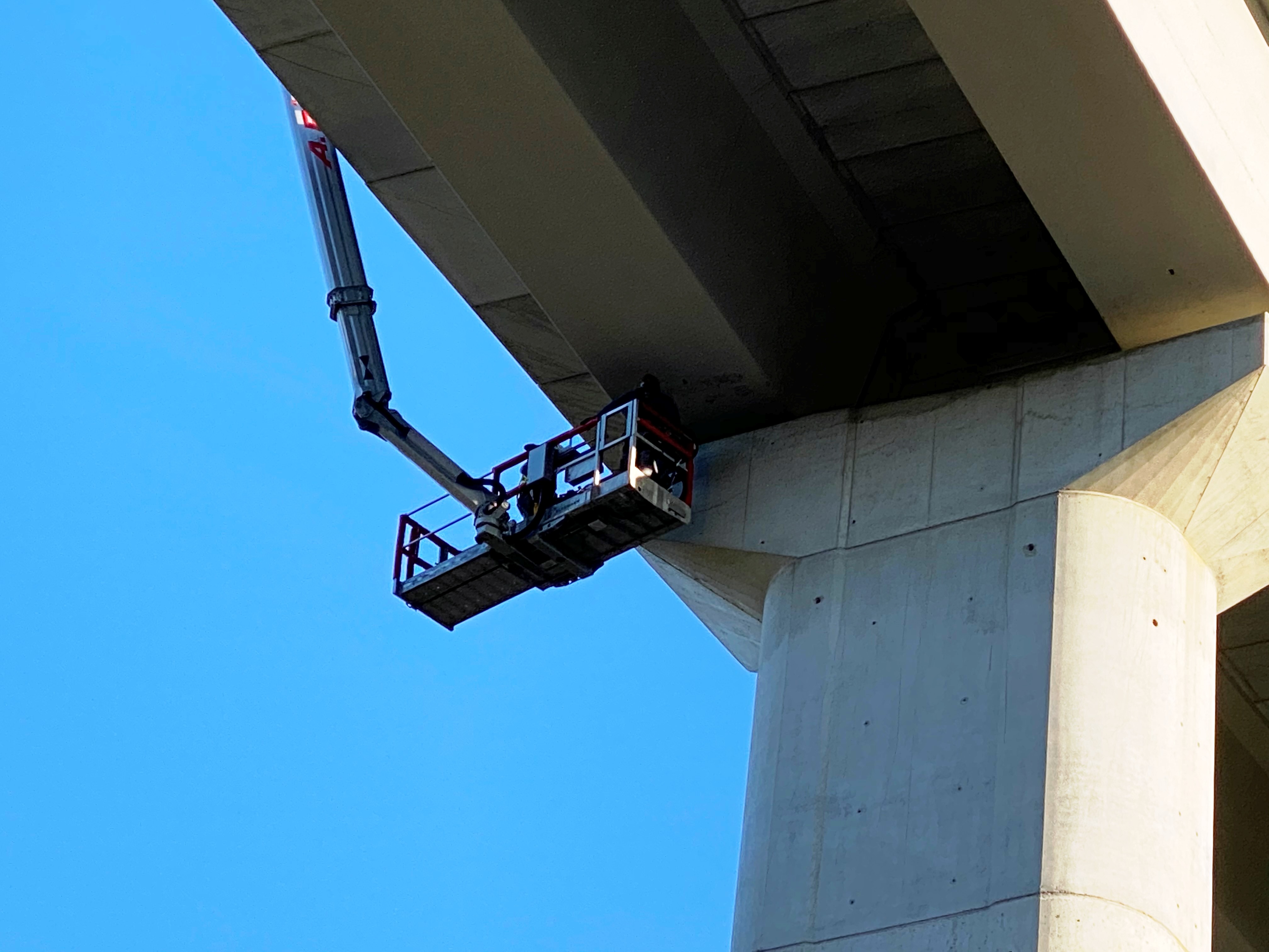 Um die Brücke zu prüfen und den Arbeitsaufwand einzuschätzen, wurde der T 570 HF auf der Brücke platziert, stabilisiert und mit sehr ruhigen Bewegungen eingesetzt. Ohne die Position der Arbeitsbühne ständig ändern zu müssen, wurden die Arbeiten reibungslos und effizient durchgeführt.