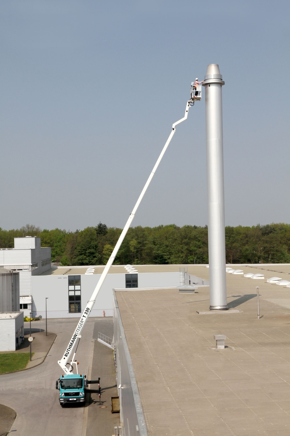 Zentraler Bestandteil des RUTHMANN STEIGER ® T 330­ ist der Vielfach-Kantprofil-Ausleger aus hochfestem Feinkornstahl mit einem starren Turmteil, welches gänzlich ohne technisch-hydraulische Sonderkonstruktionen auskommt und bei seitlichem Verschwenken nicht über die Spiegelbreite des Fahrzeugs ausschert.