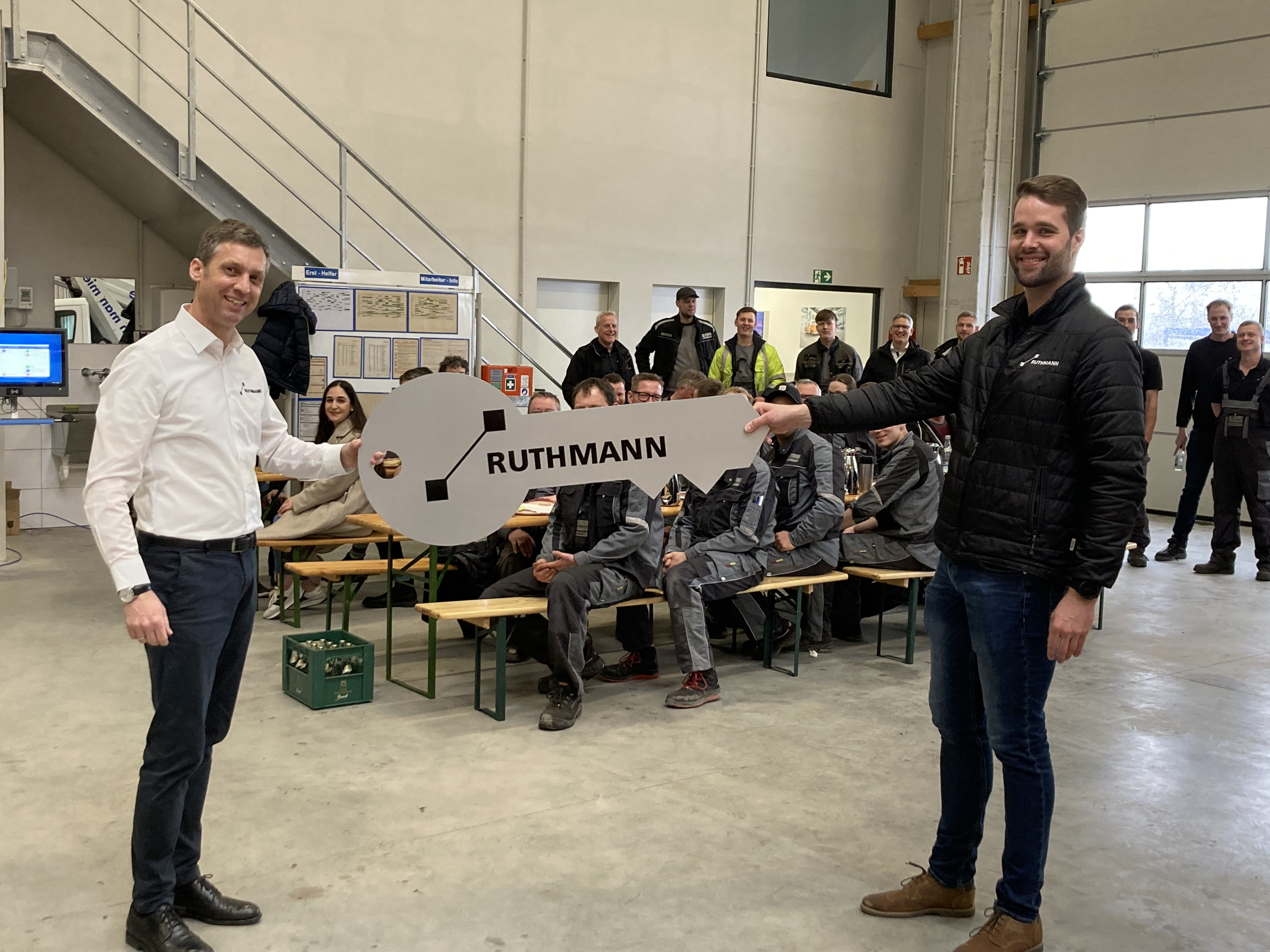 Die neue RUTHMANN Service-Halle in Gescher Hochmoor wurde offiziell eingeweiht. Uwe Strotmann, Geschäftsführer bei RUTHMANN, übergab symbolisch den Schlüssel an Daniel Plesker, Leiter der Service Station, und bedankte sich bei allen Kolleginnen und Kollegen für die großartige Unterstützung beim Umzug, der sehr schnell und vorbildlich durchgeführt wurde.