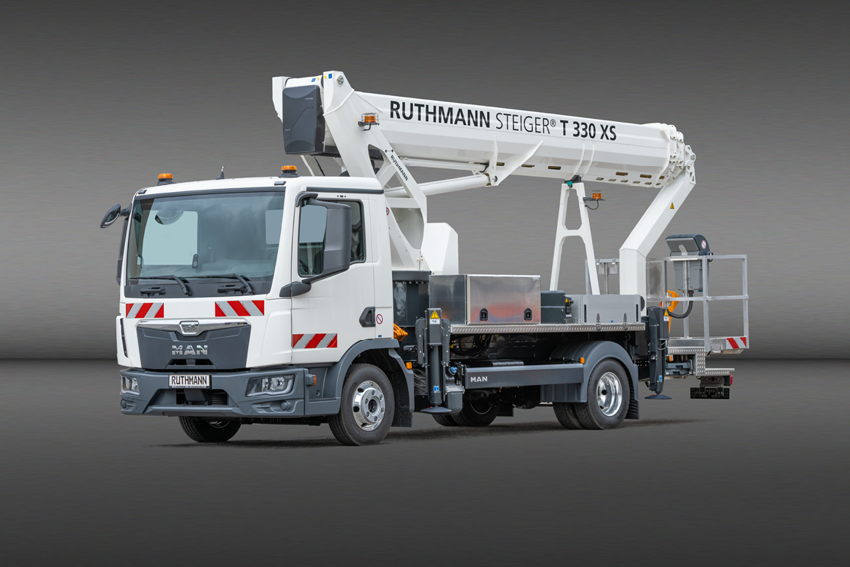 Die neue Arbeitsbühne mit dem Zusatz XS ist mit 8,43 Metern Länge rund 40 cm kürzer als der bisherige STEIGER® T 330 und damit die kompakteste und weiterhin einzige 33-Meter-Arbeitsbühne auf einem 7,49-t-Fahrgestell am Markt. Der neue STEIGER® T 330 XS erreicht jetzt 21,75 Meter Reichweite – fast 60 cm mehr als sein Vorgänger. Durch die kürzere Fahrzeug-Baulänge und den verringerten hinteren Überhang lässt sich der STEIGER® T 330 XS im beengten Umfeld noch besser handhaben und ist mit einem Radstand von nur 3,90 Metern sehr wendig. Der neue RUTHMANNSTEIGER® T 330 XS ist für viele Einsatzbereiche von der Gebäudereinigung bis hin zum Baumschnitt perfekt geeignet, bei denen bisher Arbeitsbühnen über 7,5 t zGG. eingesetzt wurden. Durch die jetzt erhöhte Korblast von bis zu 350 kg in Verbindung mit der besonders großen Reichweite ergeben sich weitere interessante Einsatzmöglichkeiten.